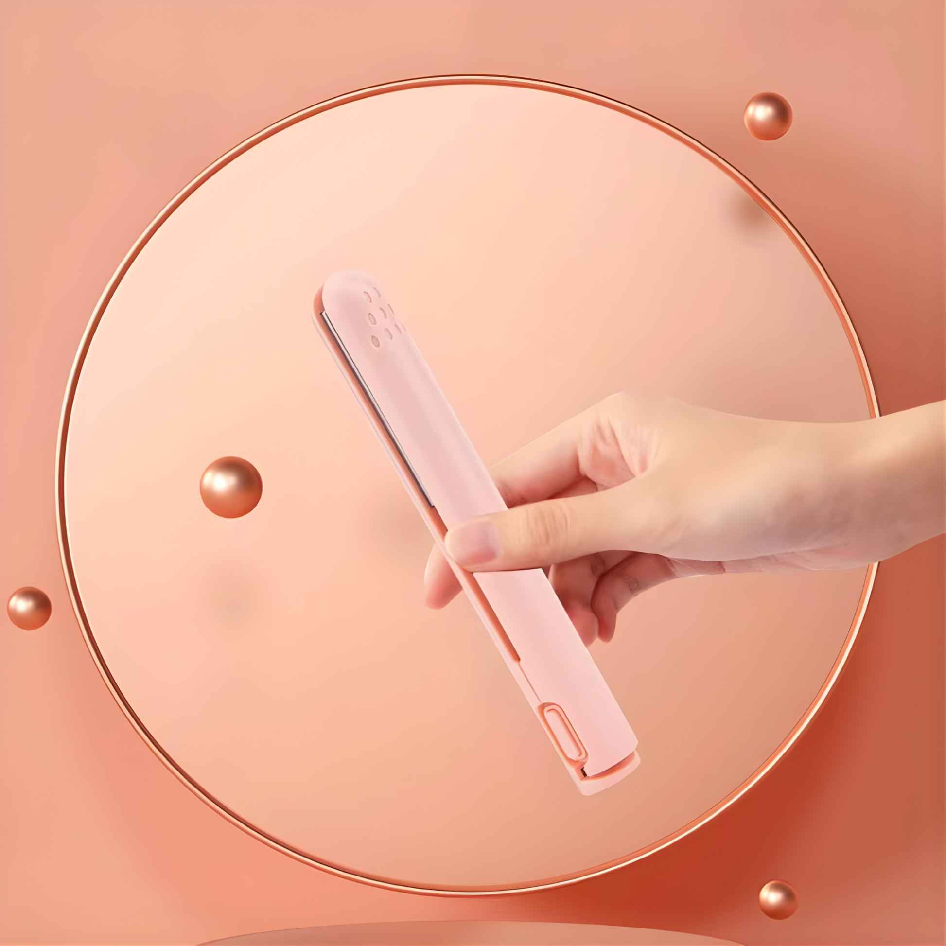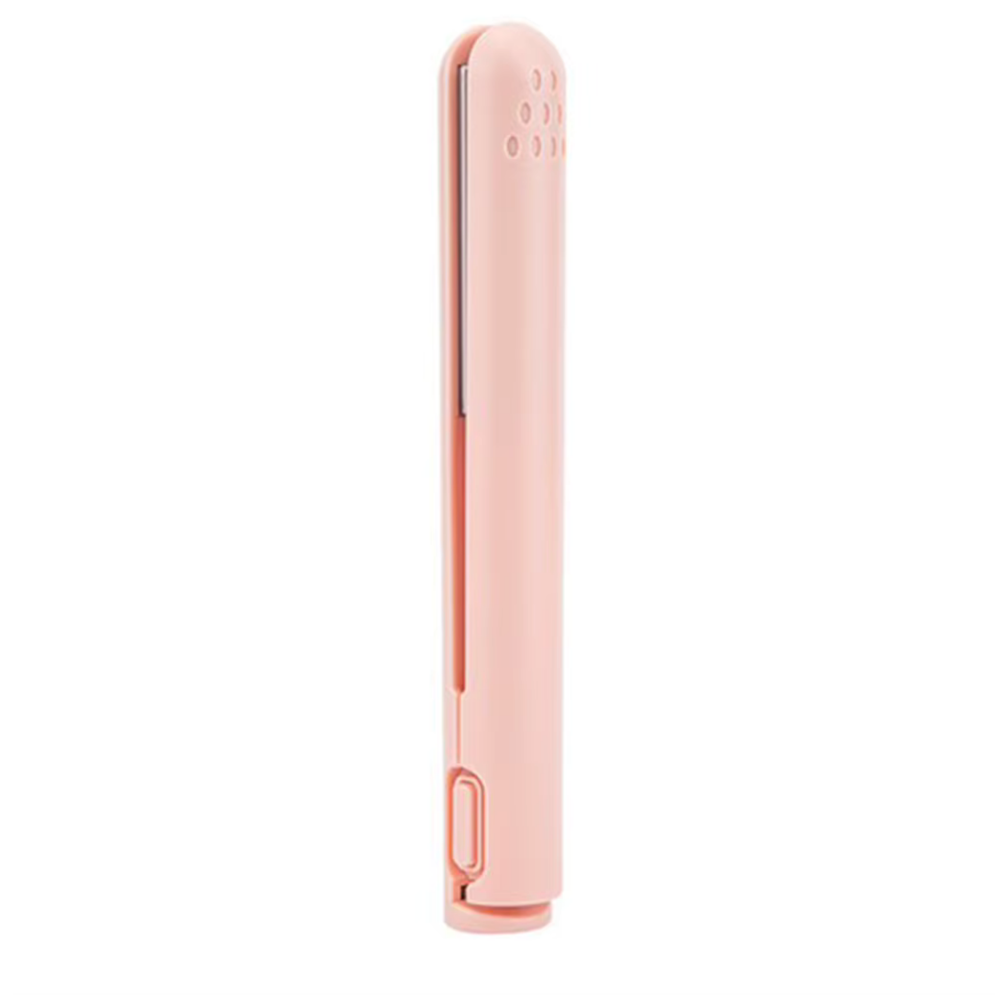 Sostén la mini plancha portátil y enciéndela. Espera unos segundos hasta que alcance la temperatura ideal.